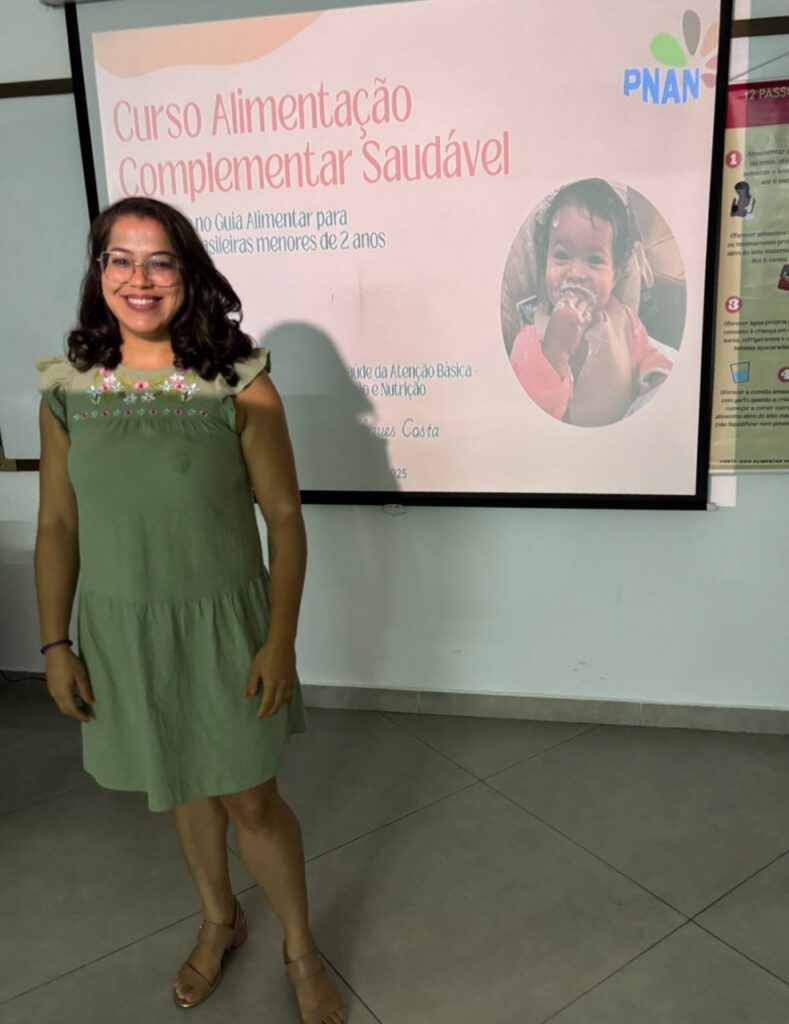 A nutricionista Priscila Chaves, referência técnica de Alimentação e Nutrição da Atenção Básica, conduziu a parte teórica e prática do curso, abordando as orientações do Guia Alimentar e estratégias para a promoção da alimentação saudável na primeira infância. A capacitação contou com a participação de profissionais das equipes de Saúde da Família, Saúde Bucal e Equipe Multiprofissional (eMulti). Nesta primeira etapa, sete equipes das Unidades de Saúde da Família (USF), uma por distrito, participaram como projeto piloto.