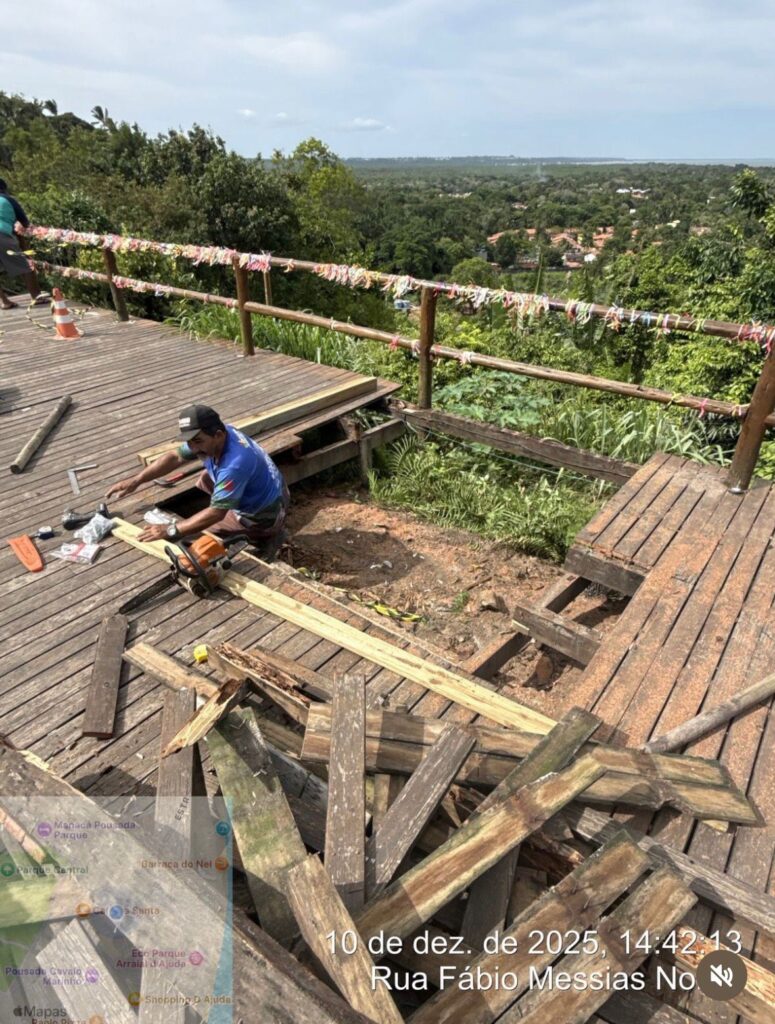 A obra inclui substituição de toda a madeira comprometida, reforço da base estrutural e melhorias gerais no acabamento. O objetivo é entregar um deck renovado, capaz de suportar com segurança o grande fluxo de pessoas que costuma visitar o mirante durante as festividades de fim de ano.